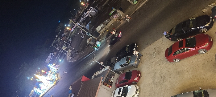 An elevated view shows a nighttime street scene. Several parked cars, mostly dark colors, line the right side of the image, with some showing sunroofs. The street curves to the left, where buildings are visible, some illuminated with festive lights. Other vehicles are on the street, including motorbikes. The sky is dark, suggesting it is late at night.