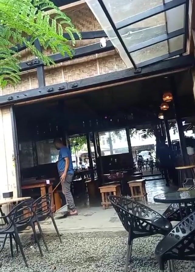 The scene shows a man sweeping the floor of an outdoor patio at a cafe