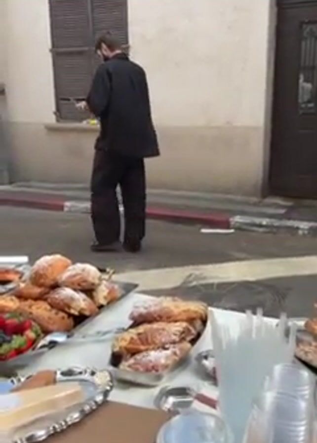 table laden with pastries and fruit, apparently set up outdoors, possibly for an event or a breakfast gathering. A man wearing a black shirt and pants walks in the background. He's holding his phone and appears to be taking pictures or videos of the scene. The table displays croissants covered in powdered sugar, regular croissants, a bowl filled with strawberries and blueberries, and a wrapped cheese. There are also stacks of plastic cups and straws. The background features a building with dark-shuttered windows and a brown door. The setting gives the impression of a street scene in a European town.
