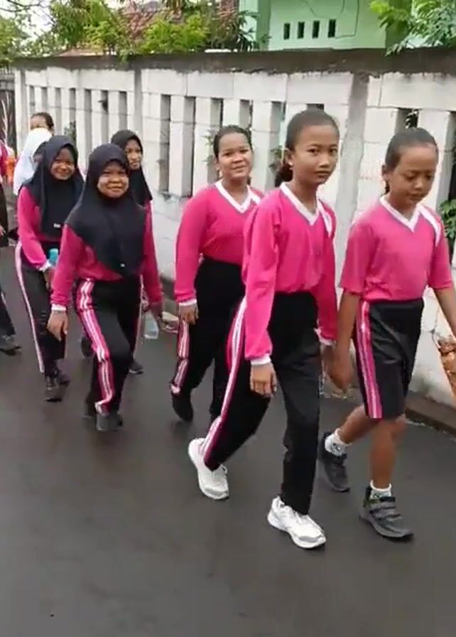 A group of children are walking along a paved street near a white fence. Most of the children wear matching pink shirts and black pants with white stripes, although some wear shorts or white or black hijabs. The children are moving from left to right in the frame, some of them carrying water bottles. They are smiling and waving at the camera. The environment seems to be a residential area.