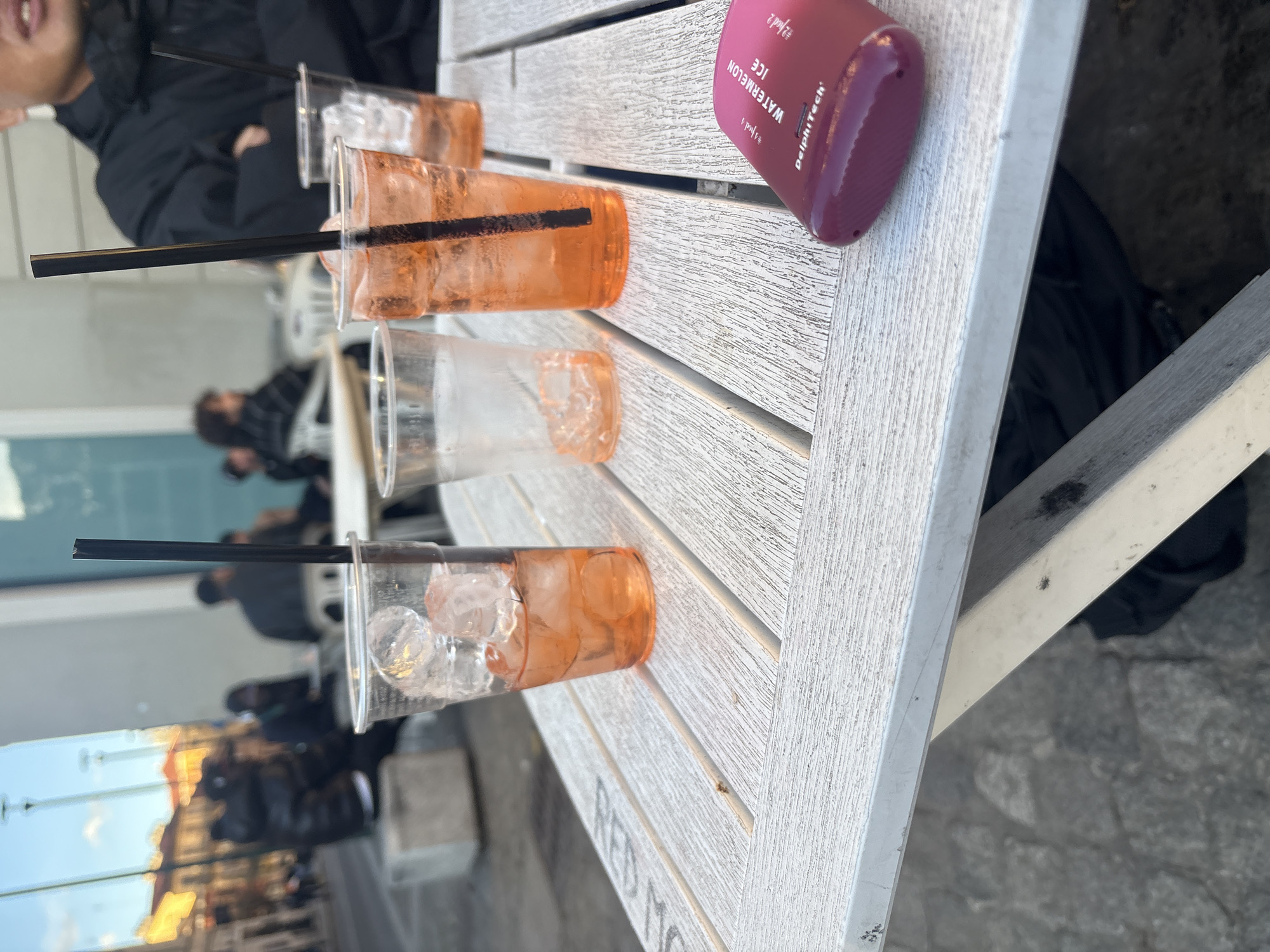 The scene shows a table on the terrace of the Red Moon restaurant in Turin, Italy. Three plastic cups with straws are partially filled with orange liquid and ice. A pink, sealed bottle sits beside the cups. People are visible in the background, some inside the restaurant and others passing by outside. The table is made of white-painted wood slats.