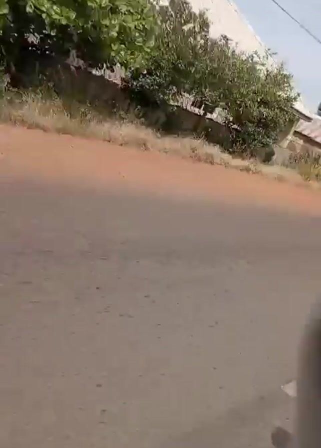 The video, shot from a moving vehicle on a paved road, presents a landscape of simple buildings and lush trees under a pale sky. The camera angle is low, partially obscured by an object, likely the person recording. As the vehicle moves, views of buildings with light-colored rooftops appear, alongside the green trees that line the road. Two people are observed standing near a small structure. The landscape appears to be rural. Electrical wires are visible stretching across the sky. The road is bare save for some loose gravel. The predominant colors in the video are variations of brown, green, and gray.