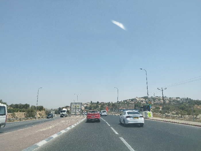The image depicts a multi-lane asphalt road under a clear, light blue sky in Efrat, Palestinian Territory