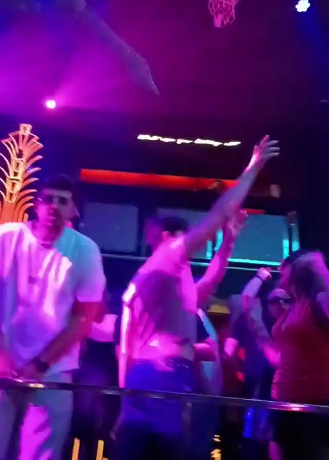 people dancing in a nightclub. They're on a slightly raised platform, moving to the music. The lighting is dark with purple and blue spotlights shining on the crowd. There's a decorative, golden, multi-tiered structure in the background. Some people appear to be holding drinks. The scene is lively and energetic.