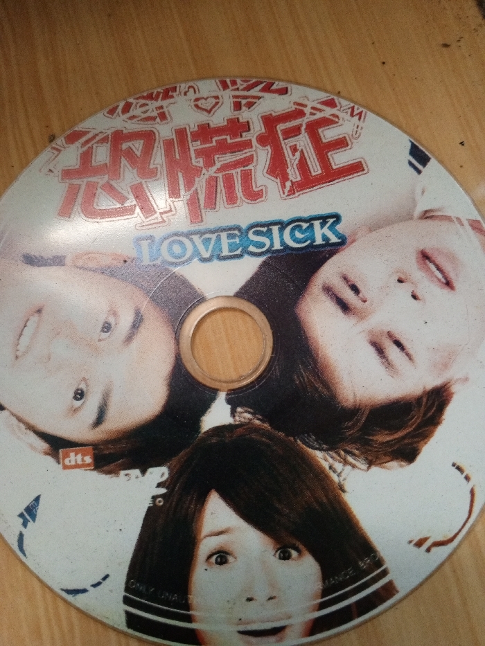 A DVD labeled "Love Sick" displays three female faces. Two are positioned upside down near the disc's center, while the third is right-side-up at the bottom. Red Chinese characters are at the top, above the title "Love Sick." The disc shows signs of wear, with markings and some discoloration. Logos for DTS and DVD are visible, along with text that reads "Only Una Performance." The DVD is on a wooden surface.