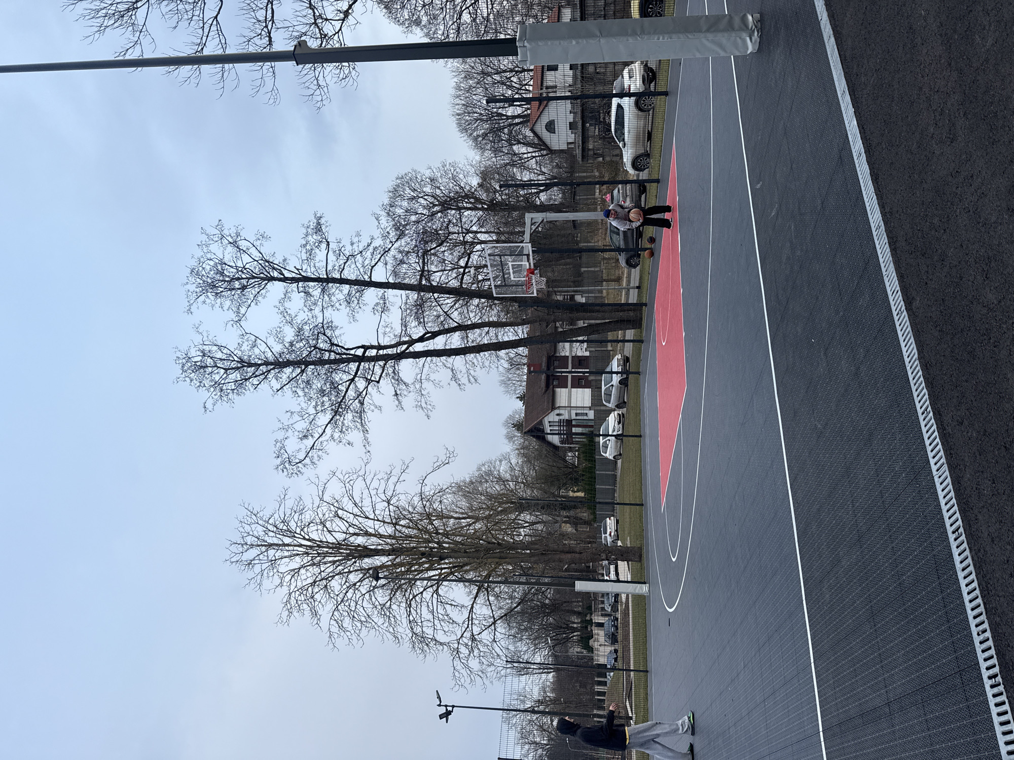The image depicts an outdoor basketball court located in Riga, Latvia. The court has a dark grey playing surface with red painted key areas, and white lines marking the boundaries and free-throw circles. A metal fence surrounds the court. One individual wearing a grey hoodie, grey pants and green sneakers stands at the bottom of the frame on the right. Another person, wearing a white jacket and a blue hat stands near the basketball hoop holding a ball. There are two basketballs on the ground. There are trees without leaves on the background and building can be seen through the fence. Overcast sky.