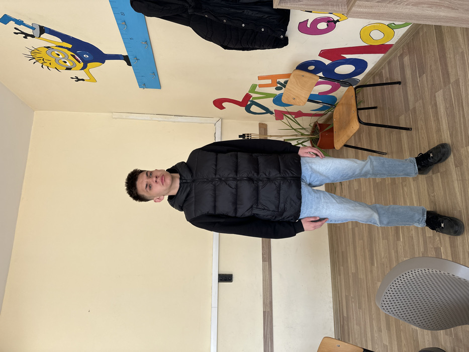 This image depicts a young male standing in what appears to be a classroom or a children's activity room within the city of Kyustendil, Bulgaria