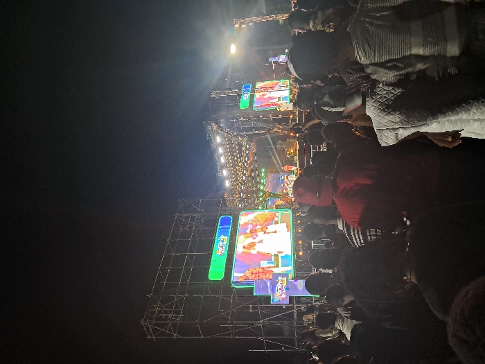 This image depicts a nighttime outdoor event in Owerri, Nigeria. A large crowd of individuals, primarily viewed from behind, occupies the foreground and midground, facing a prominent, brightly illuminated stage structure. The stage is characterized by extensive scaffolding, numerous overhead lighting rigs, and multiple large LED display screens. The central LED screen presents a figure in white attire performing, accompanied by other individuals. Auxiliary screens, some featuring green borders, display additional visual content and text, including "Worship." Beams of light emanate from the stage area, projecting into the dark sky. Attendees in the visible crowd wear various casual clothing, such as a red hooded top on a central figure and a white quilted vest on a figure in the right foreground. The scene portrays a public gathering observing a performance or presentation on stage.