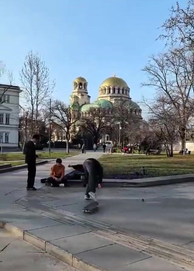 group of people in a public square with the St. Alexander Nevsky Cathedral in the background. One person is attempting a skateboard trick, which fails. There are three other people. One is standing watching the skater, and two are seated nearby. The cathedral is a large, domed building with gold accents. The square is paved and there are trees around the edges. The sky is blue and clear.