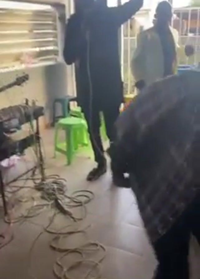In a brightly lit, indoor space, a group of people are gathered, seemingly enjoying a musical performance. A woman in a dark red dress sits to the left, playing a guitar and singing into a microphone. Next to her, a man dressed in black raises his hand while singing into a microphone. In front of them, a tangled array of wires and musical equipment is visible on the floor. Several people are dancing, while one in a plaid shirt walks in front of the camera. The space is open, with a large window letting in natural light, revealing trees outside. A few small green and yellow stools are scattered around the room.