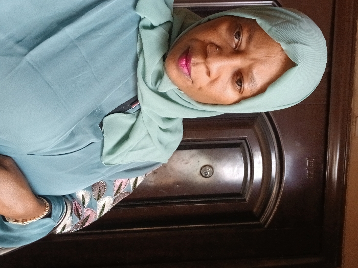 A female subject is depicted in a close-up, frontal portrait. She wears a light mint green hijab covering her head and neck, along with a matching long-sleeved garment. The right sleeve of her garment exhibits an intricate patterned design in silver, pink, and pale green. A gold-toned bracelet is present on her right wrist. Her lips are colored with bright pink lipstick, and a small metallic stud is visible in her left nostril. Her expression is neutral, and her gaze is directed towards the camera. The background consists of a dark brown door, possibly metal, featuring a recessed panel design and a circular metallic peephole or fixture in its lower central area. Unidentifiable faint text is present on the door above the fixture. The upper wall above the door is a light beige color. The scene is located in the city of Shaba, Nigeria.