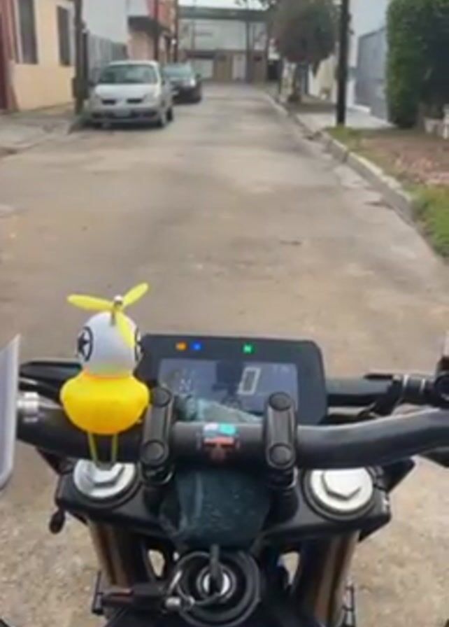 The view from the rider's seat of a motorcycle parked on a street in a residential neighborhood is seen in this short video. The motorcycle’s digital instrument panel shows the bike is in neutral and is not moving. A yellow rubber duck with a propeller on its head is attached to the motorcycle's handlebars, adding a whimsical detail to the scene. The street is narrow and lined with buildings and parked cars. There are trees and other vegetation visible on either side of the road. The sky is overcast, indicating a cloudy day. No people are seen in the video. The scene is still and quiet, providing a glimpse into a typical residential area.