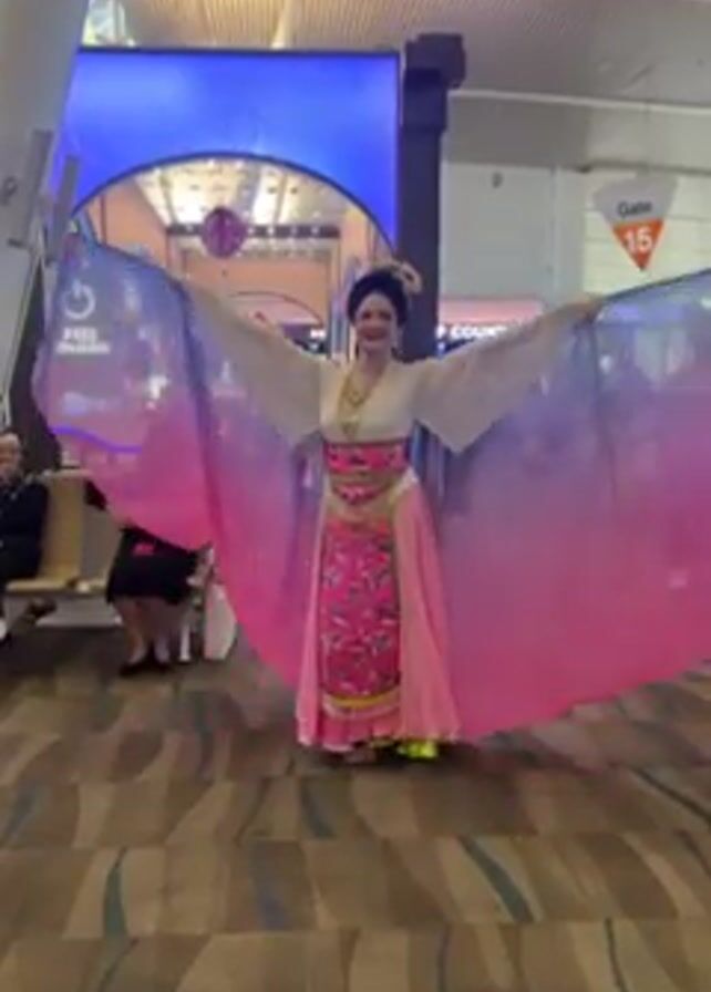 A woman in a colorful costume stands in an airport, holding out long, ombre-colored fabric "wings." The fabric is dark blue or purple at the top, fading to pink at the bottom. The woman's costume appears to be of Asian origin, with a white top, pink skirt with floral embroidery, and a decorative headdress. She is smiling. Behind her, travelers and airport signage are visible. The floor is patterned with blue, brown, and cream colors. There are airport seating areas to the sides.