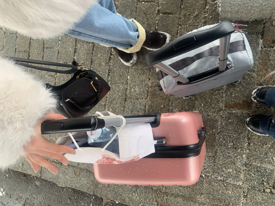 An overhead view captures two individuals and their belongings on a stone-paved surface with patchy snow, located in Zakopane, Poland. One individual, positioned left-center, is partially visible from the upper thigh to the chest. This person wears a white fur-like jacket, light blue jeans with cuffed hems, and brown, fur-lined boots. A black handbag with gold-colored hardware is slung over their arm. Their right hand grips the black, extended handle of a pink, hard-shell rolling suitcase. A white paper bag, featuring a red design and containing a plastic bottle of Żywiec Zdrój mineral water, is suspended by its rope handles from the suitcase's telescopic handle. To the right of the pink suitcase is a gray, soft-shell rolling suitcase with an extended black handle. The feet of a second individual are visible at the bottom-center of the frame, clad in dark blue jeans and black boots. Sparse snow accumulation is present on all visible footwear, lightly speckles the paved surface, and is visible on the surfaces of both suitcases. The stone pavement is wet in areas.