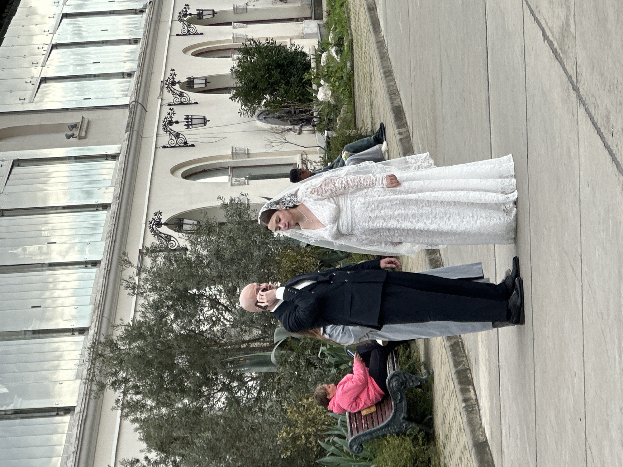 The image captures an outdoor scene at the Sochi Arboretum (Dendrarium) in Sochi, Russia, identified by the distinctive, ornate architecture of the building in the background. This building presents a light-colored facade with multiple arched window openings and decorative black wrought-iron lanterns on its lower level. The upper section features a series of tall, narrow, reflective or translucent panels, potentially modern window treatments. In the immediate foreground, a male, appearing to be a groom, stands centered on a light-colored paved walkway. He is bald, dressed in a dark suit with a white shirt, and is holding a dark smartphone to his right ear, actively engaged in a phone call. To his right, a female, appearing to be a bride, stands in a white, long-sleeved, V-neck lace wedding dress with a white veil draped over her head. She is looking slightly downwards with a neutral expression. A third individual, wearing light gray clothing, is partially obscured behind the groom. To the left of the main subjects, a woman in a bright pink hooded jacket and dark pants is seated on an ornate, dark-colored park bench, focused on a smartphone in her hands. Further back on the right side of the frame, another individual wearing a dark cap and jacket is seated on a similar park bench. The environment includes various trees, shrubs, and large agave-like plants in landscaped beds alongside the paved walkway. The sky is overcast, indicating diffused lighting conditions.