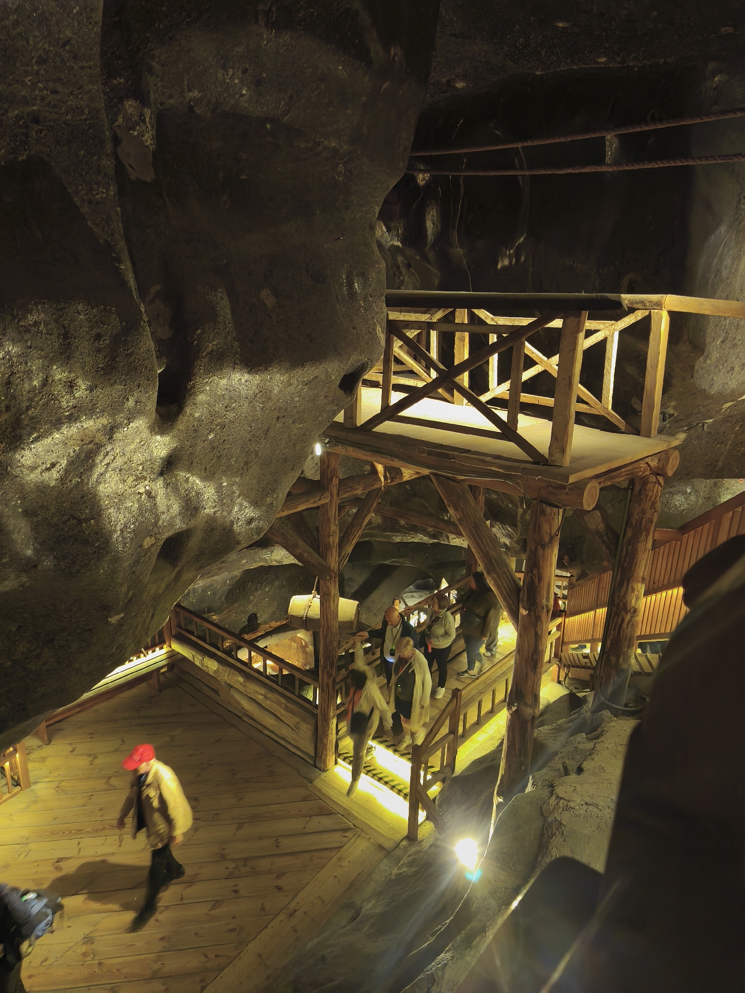 The image depicts an underground cavern, likely within the Wieliczka Salt Mine in Wieliczka, Poland. The cavern features rough, uneven rock formations, some of which appear to have been illuminated. A multi-tiered wooden structure is present, including a viewing platform with railings. Several people are on the structure, including an individual wearing a red cap walking on the lower level, and others on a higher level. The lighting is artificial and warm, highlighting the wooden construction and some of the rock surfaces. Ropes are suspended near the top of the frame.