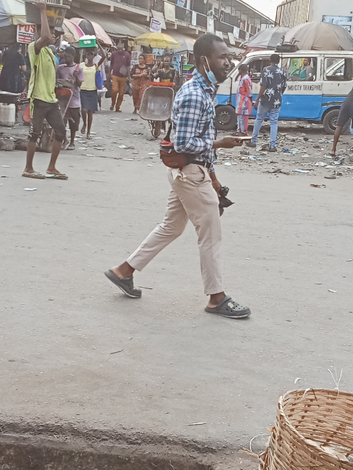 The image captures a busy street scene within Owerri, Imo State, Nigeria, indicated by a "IMU CITY TRANSPORT" minivan present. The ground consists of a grey, paved surface, showing moderate wear and scattered debris. In the lower right foreground, a segment of a light-brown woven basket is visible. The central subject is an adult male, depicted mid-stride, walking from right to left across the midground. He wears a blue and white plaid long-sleeved shirt, light beige trousers, and grey Crocs-style sandals. A reddish-brown fanny pack is secured around his waist, and a light blue surgical face mask hangs below his chin. He holds a light-colored mobile phone in his right hand and a black object, possibly a camera or small bag, in his left hand. In the background, to the left, another male in a light green shirt and dark shorts stands with his right arm raised, holding an indistinct object above his head. Multiple pedestrians are visible, including one individual carrying a white item on their head and another pushing a wheelbarrow containing a grey metallic basin. Buildings with multiple stories, commercial signage, and yellow market umbrellas line the street. To the right, a light blue and white "IMU CITY TRANSPORT" minivan is present, with an individual in a patterned shirt and blue jeans standing near it. The environment is indicative of a bustling urban market or commercial district.