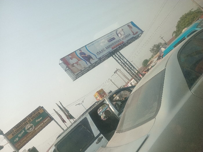 This image depicts a daytime urban street scene in Oshogbo, Osun State, Nigeria, specifically near the Oya Efun Motor Park, as indicated by a prominent signboard. The sky is bright and hazy. In the immediate right foreground, the rear section of a light-colored sedan is visible, showing its rear window and part of the trunk. To its left, a white van or SUV is partially obscured, with its passenger-side door open. Further left, a rectangular signboard clearly identifies the "ROAD TRANSPORT EMPLOYERS ASSOCIATION OF NIGERIA (RTEAN) Sagamu Branch, OYA EFUN CHAPTER (MOTOR PARK) OLORUNDA L.G.A OSHOGBO, OSUN STATE". Dominating the upper midground is a large billboard elevated on a metal truss structure. This billboard displays two male subjects: one seated, dressed in white traditional attire, and another standing, dressed in blue traditional attire. Text on this billboard reads "ISAAC AKINMUYIWA AGARAH" and "60th", indicating a commemorative or celebratory message. Overhead, multiple thin utility lines traverse the hazy sky. In the distant background, additional vehicles, scattered trees, and indistinct urban structures are discernible, consistent with a bustling roadside environment. The vehicles in the midground appear stationary, suggesting traffic or a parking area.