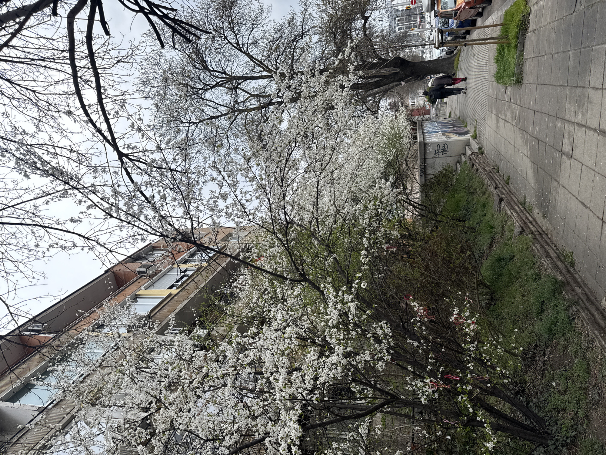 The image depicts an urban street scene in Sofia, Bulgaria, during what appears to be early spring. A paved sidewalk, constructed from rectangular concrete pavers, occupies the right half of the foreground and extends into the midground. To its left, a dirt verge with unkempt grass and low greenery is retained by a low, weathered brick wall. Prominently featured on the left are several deciduous trees and bushes in full bloom, covered densely with small white flowers. Numerous red and white braided ribbons, identified as Martenitsi, are tied to the branches of these flowering trees. Behind the foliage, a multi-story residential building stands, characterized by a grey facade, reddish-brown sections, and multiple balconies with reflective windows. External air conditioning units are mounted on the building's exterior walls. In the midground on the sidewalk, two individuals walk away from the viewer. One figure wears dark clothing, and the other wears a dark jacket over red trousers. Further down the sidewalk, a large, mature deciduous tree with extensive, mostly bare branches rises beside the path. The background shows a street with parked automobiles, including an orange vehicle, and additional urban structures under a uniformly overcast, light grey sky. Graffiti marks a concrete barrier structure bordering the left side of the sidewalk in the distance.