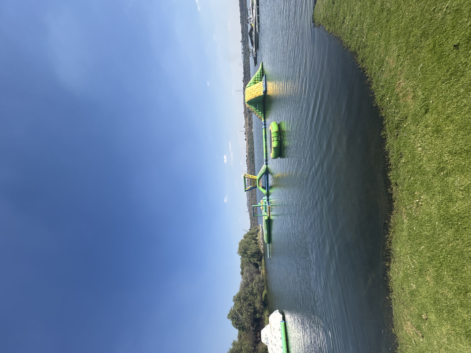 An aquatic obstacle course floats in a lake on a clear, sunny day