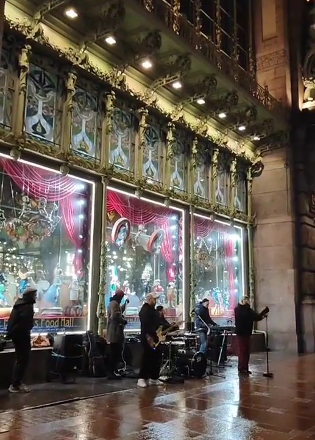 The video depicts a band performing live outside a beautifully decorated building. The building, with its ornate facade and large windows displaying elaborate decorations, looms over the scene. The band consists of about five members, playing various instruments including a guitar, drums, and a microphone for vocals. The ground is wet, reflecting the lights from the building and indicating recent rain. Several people stand around watching the band, some holding bags or wearing winter coats. The overall atmosphere appears vibrant and festive.