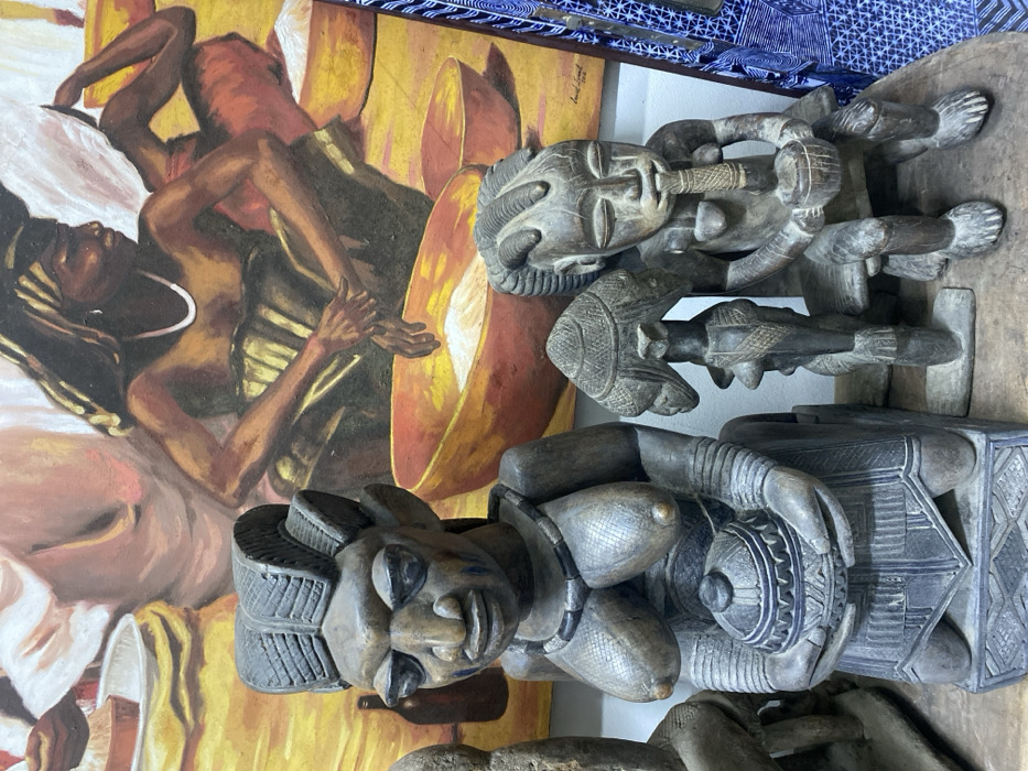 The image displays a collection of traditional African wooden sculptures positioned in front of a large painted canvas in an indoor setting, identified as Ikate, Nigeria