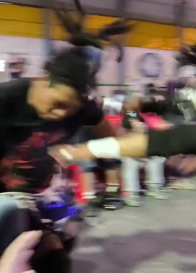 Two wrestlers engage in a physical altercation near ringside spectators in an indoor wrestling venue. The wrestler on the left has dreadlocks, a black t-shirt with a graphic on the front, and wrestling gear. He is seen hitting his opponent against the barrier separating the ring from the audience. The wrestler on the right wears shiny wrestling tights, white socks, and wrestling boots. Spectators, including women and men of various ages, sit on chairs near the barrier and watch the action, some capturing it on their phones. The environment features a high ceiling with yellow-painted support beams, metal barriers, and the blurred background of the wrestling ring.