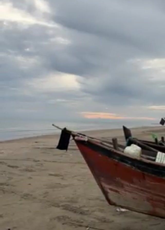 static shot of a beach scene. In the foreground is a weathered red boat resting on the sand. The beach extends to the horizon where the sea meets the sky. The sky is overcast with heavy clouds, and a faint orange glow suggests a sunrise or sunset on the horizon. The scene appears tranquil and still.