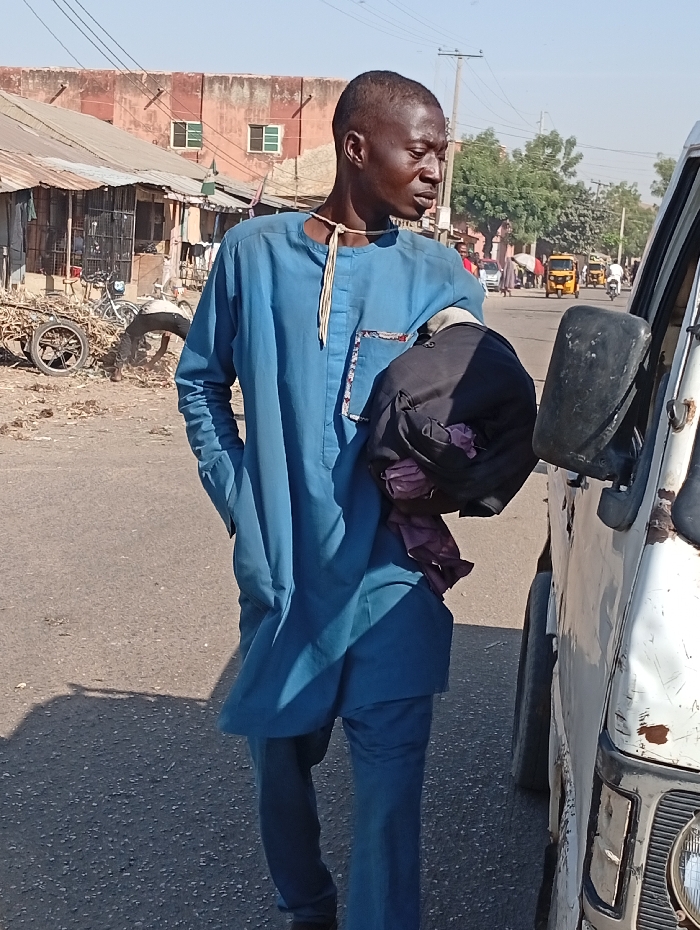 A man wearing a blue tunic and pants stands on a street. He has a dark bag slung over his shoulder. His hand is in his pocket. An older white van is to his right. In the background is a street with various buildings and structures, including a bicycle, tricycle and other vehicles. Overhead powerlines are visible. The day seems sunny.