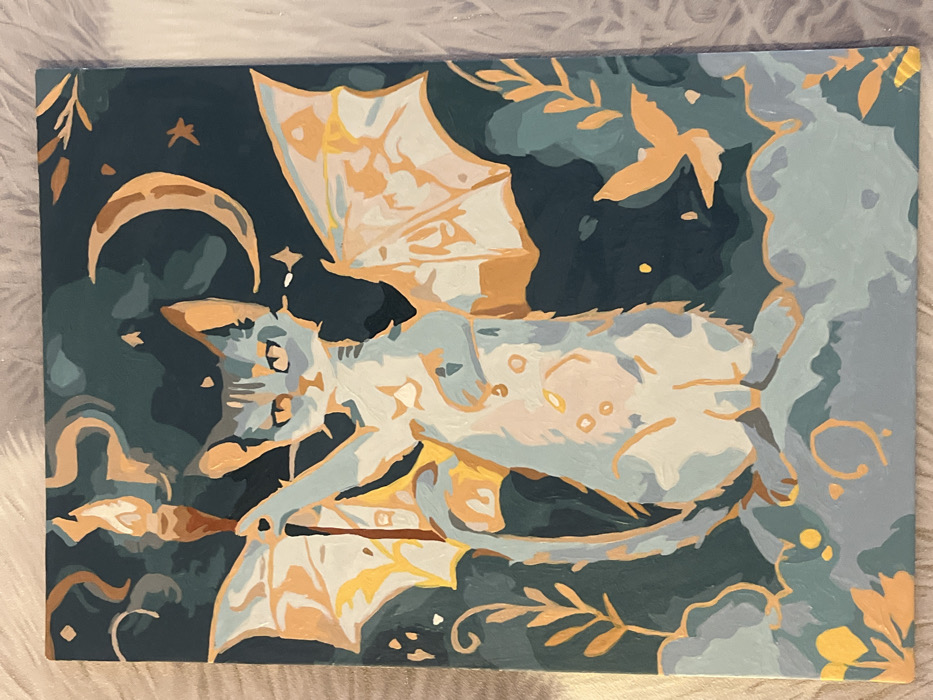 This is a photograph taken in the city of Семибратово, Russia, displaying a vertical, rectangular painting. The artwork depicts a stylized, bipedal cat-like creature with a light blue-gray body and large, light orange bat-like wings extending from its back. The creature stands on a light blue cloud formation, holding a dark brown staff with a bright orange-yellow flame at its tip in its raised left paw. Its face features large, dark eyes with light blue irises and light orange ears. The background is a dark teal-green, populated by a light orange crescent moon in the upper right, scattered small orange stars, and stylized light orange and teal foliage. A small, light orange bird-like figure is depicted flying in the lower right background. The painting utilizes a defined color-block style with a limited palette, resting on a light-colored, textured fabric surface.