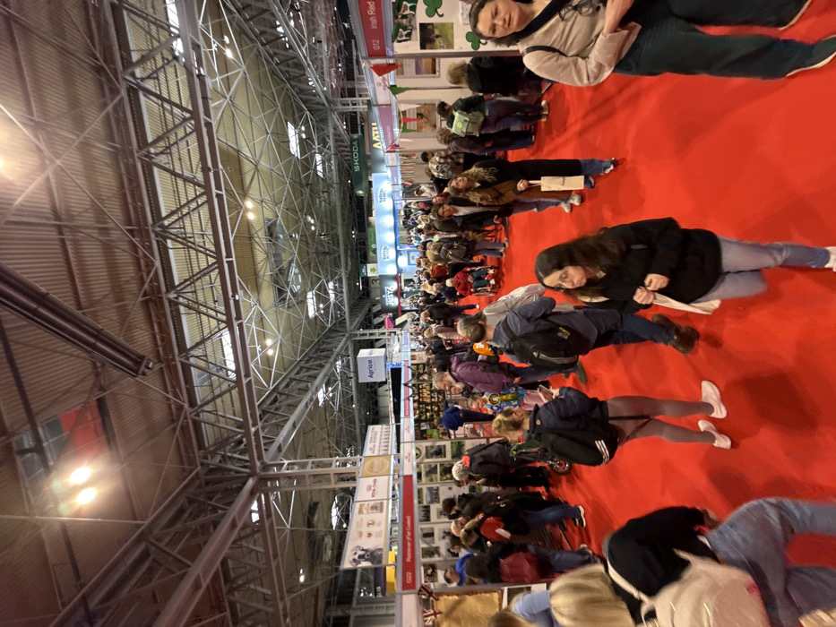 The image displays a bustling indoor exhibition hall at the National Exhibition Centre (NEC) in the Metropolitan Borough of Solihull, United Kingdom