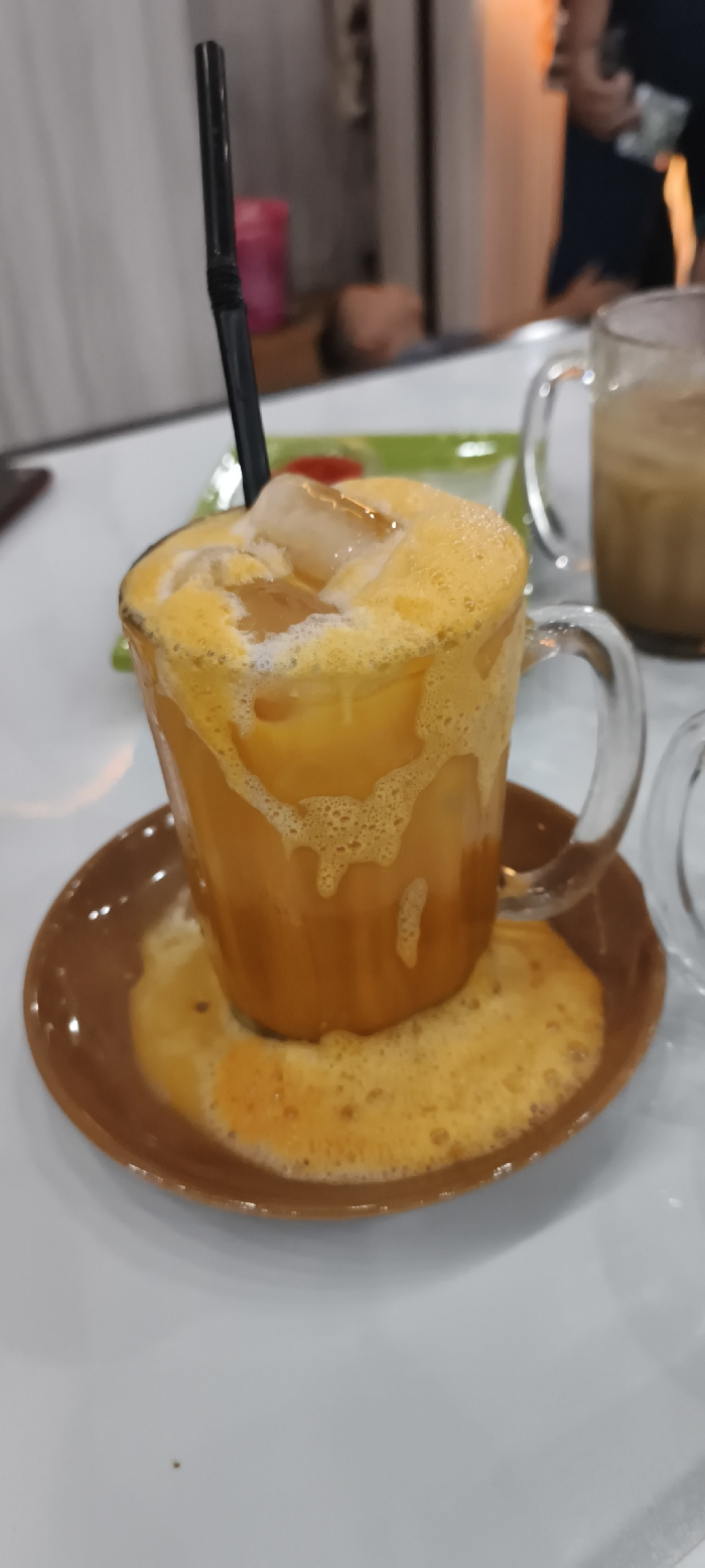 A clear glass mug, filled with an orange, frothy, iced beverage, rests on a brown, circular saucer on a white tabletop in Matangjareung, Indonesia