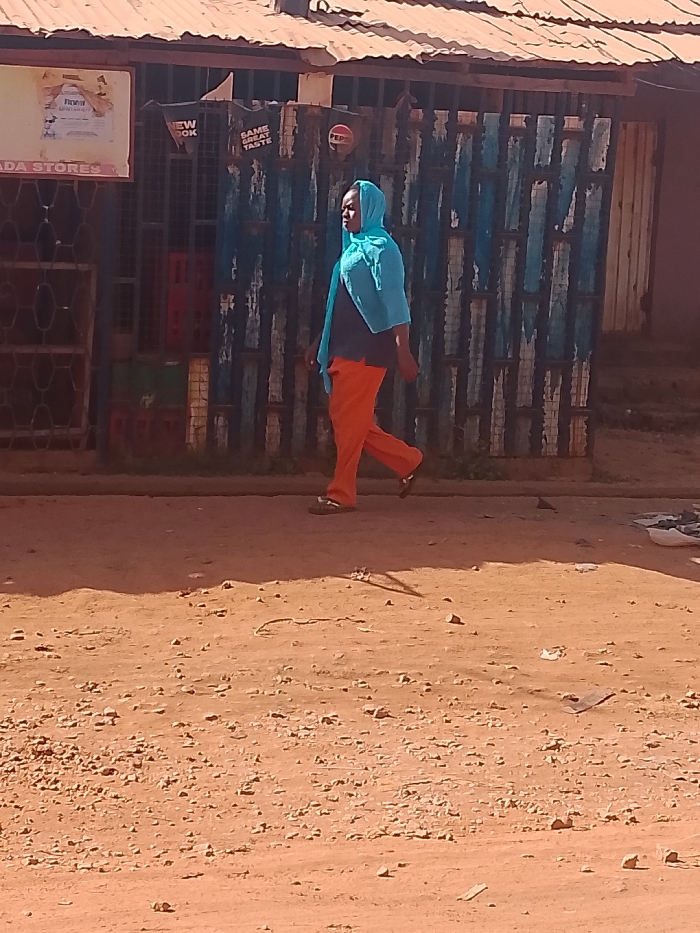 The image captures an outdoor, daytime scene within the city of Unknown, Unknown, depicting an adult female walking from left to right on an unpaved, reddish-brown dirt path. She is dressed in a dark top, bright orange pants, a light blue headscarf, and sandals. Her head is oriented slightly to the left. The path surface is uneven, covered with scattered small rocks and debris. In the background, a single-story building with a corrugated metal roof features a blue, vertically paneled facade. Attached to the facade are a partially legible white sign displaying "ADA STORES" and other text, two black signs reading "NEW LOOK" and "GAME GREAT TASTE," and a red and blue circular Pepsi logo. Red plastic crates are visible behind a dark metal gate on the left side of the building. Strong sunlight illuminates the scene, casting a shadow from the individual onto the ground.
