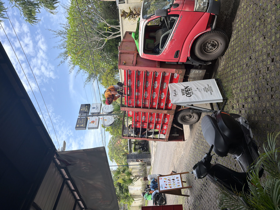 A red truck loaded with Bintang beer cases is parked on a paved street. A worker stands on top of the load, securing it. A black scooter is parked near the truck. A sign reading "We're Open" stands beside the truck. In the background, there are buildings, trees, a menu board, and people sitting on scooters. The sky is partly cloudy.