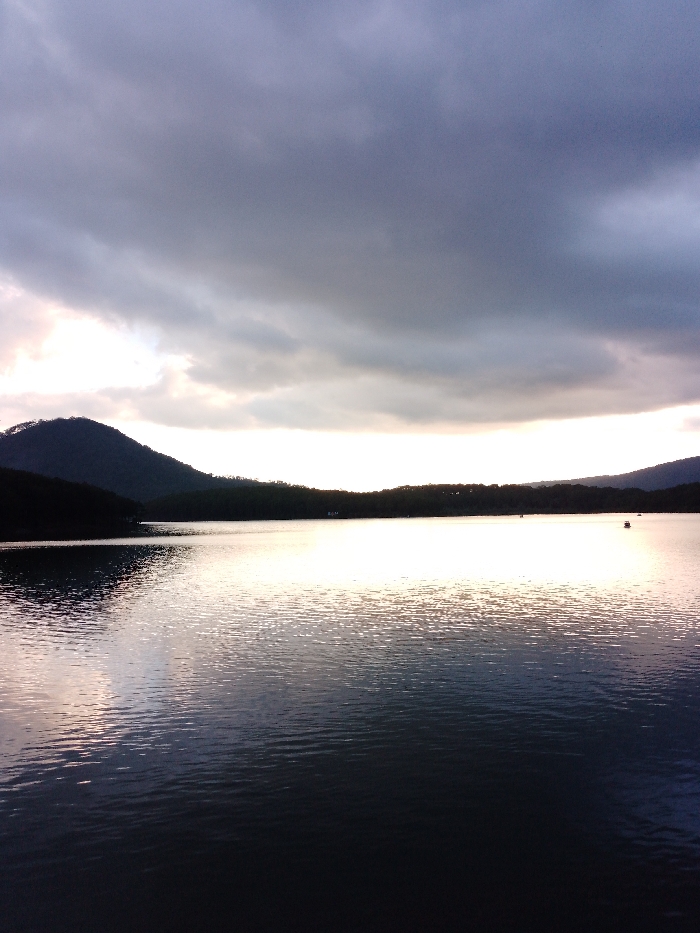 The image captures a wide view of Tuyen Lam Lake in Da Lat, Vietnam, under an overcast sky. The upper half of the frame is dominated by heavy, dark grey clouds, with a prominent horizontal band of diffused, bright white and pale yellow light spanning the horizon, indicating the obscured position of the sun. Dark, tree-covered hills form the distant shoreline on both sides of the lake, appearing as silhouettes against the bright light. The surface of the lake, which occupies the lower half of the frame, is covered in subtle ripples, reflecting the subdued light from the sky and appearing darker towards the foreground. Two small, dark, indistinct objects, consistent with recreational boats, are visible on the lake's surface in the mid-ground, with one more clearly discernible on the right side. No discernible human figures or specific actions are evident within the scene.