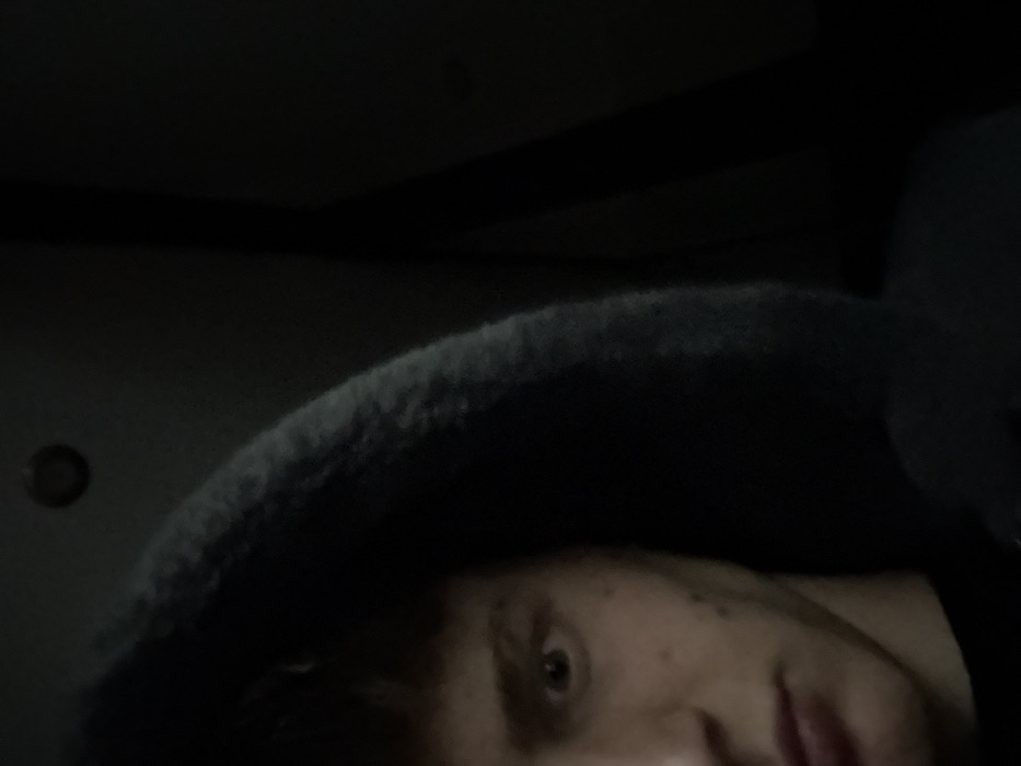 A partial frontal view of a young male subject is depicted in a dimly lit environment. The subject's left eye, brow, and a portion of his nose and mouth are visible. The eye is wide open with a light-colored iris, directed towards the viewer, indicating a direct gaze. The visible skin is fair, with several small blemishes or freckles on the left cheek. The subject wears a dark-colored, possibly black or dark grey, hooded garment, with the hood pulled up to frame the left side of his face. The texture of the hood appears slightly fleecy. The right side of the subject's face is obscured by shadow and the hood. The background is predominantly dark and indistinct, suggesting an enclosed space. A faint circular object is visible in the upper left background, and a vertical dark line runs along the right side of the background. No other individuals or discernible objects are present. The scene takes place in Plovdiv, Bulgaria.