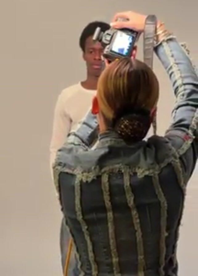 A photographer is taking pictures of a male model in a studio. The photographer is wearing a denim jacket with frayed edges and has her hair pulled back into a bun with a net. She is holding a camera up to her eye and looking at the model through the viewfinder. The model is wearing a long-sleeved white shirt and jeans. He has dark skin and short, curly hair. He is standing in front of a white backdrop. There is a large light fixture hanging from the ceiling above them. The model has his hands in his pockets and is looking down slightly.
