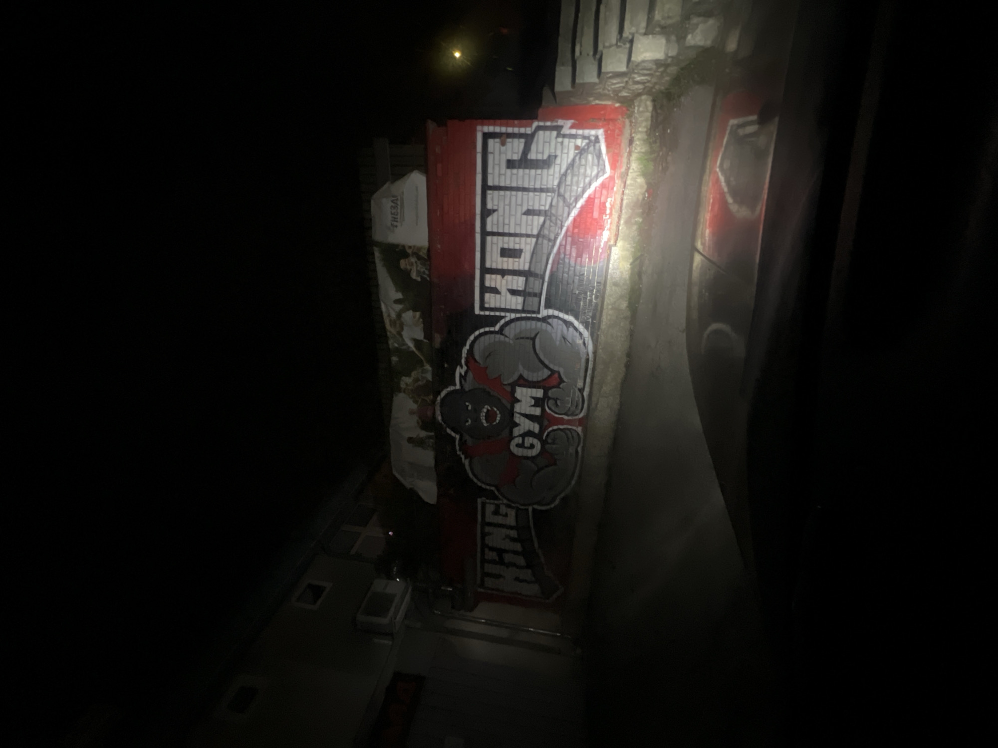 This image displays a nighttime street scene in Bankya, Bulgaria, captured from the interior perspective of a vehicle. The primary subject is a multi-colored graffiti mural on a red-painted brick wall. The mural features a central, stylized, muscular grey gorilla-like figure with red accents, wearing a red vest inscribed with "GYM" in white letters. To the left of the figure, the word "KING" is written in grey and white block letters, and to the right, "KONG" appears in similar styling. Above the mural, a white banner is visible, partially obscured, with legible text "THESA". Further above and to the left, a building facade with windows and an external air conditioning unit is discernible. To the right of the mural wall, a light-colored stone block retaining wall or steps is present. The foreground shows the dark dashboard and hood of the observation vehicle, reflecting the illuminated mural and wall. A solitary light source is visible in the upper right background. No individuals are present in the scene.
