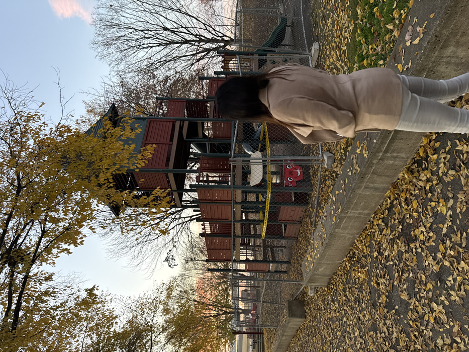 A playground structure with multiple levels of wooden platforms and ladders stands behind a chain-link fence. Yellow leaves cover the ground, a concrete ledge, and the fence. A person in a tan coat and gray leggings stands near the fence, facing the structure. Some trees with yellow leaves are to the left of the structure. A red toy is partially visible behind caution tape. The sky is visible in the background.