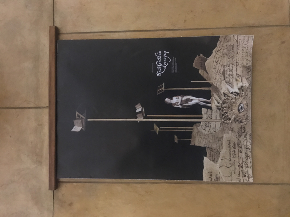 A poster is hanging on a wall. The wall is made of tan-colored stone. The poster is black with a white border. The poster features an image of a person standing in a field of sticks. The person is facing the right side of the poster. They are standing on a white surface. The person's arms are down by their sides. The person has long brown hair and they appear to be wearing no clothes. The sticks are all the same length and are perpendicular to the ground. There are many objects on the sticks, including books and other rectangular objects. All of these objects are brown and have black designs. The objects appear to be in disrepair, with tears and folds. The bottom half of the poster is made up of a series of brown and white papers, that appear to have writing in an unknown language on them. At the top of the poster in the center of the poster in white lettering reads, "Казанова". The poster is held up by a wooden frame that is attached to the wall. The wooden frame is brown. This poster is located in L'viv, Ukraine, near a cultural institution at coordinates 49.844, 24.028. The poster's subject matter appears to be related to human anatomy and medicine.