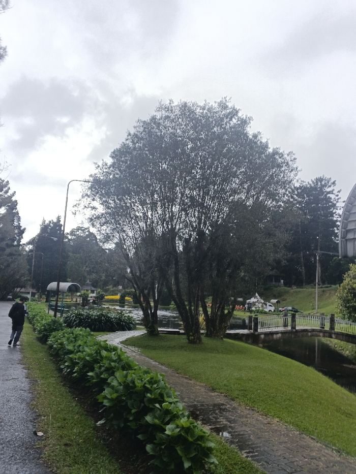This image depicts a park-like outdoor environment in Matopos, Zimbabwe, under an overcast sky. The scene is characterized by dense green vegetation, paved pathways, and a body of water. In the foreground, a dark, wet paved path runs along the left side of the frame. A single individual, dressed in a dark jacket and light trousers, walks away from the camera on this path, positioned towards the lower-left corner. To their right, a neat row of dense green shrubs borders the path, separating it from a manicured grassy lawn. A lighter-colored, possibly stone-tiled, winding pathway extends into the midground, curving through the grassy areas. Several trees with dark, thick foliage are prominently featured, situated on a bank adjacent to a calm, dark body of water that traverses the mid-right section of the image. The water reflects the subdued light from the sky. Crossing the body of water is a decorative, low-arched bridge with light-colored railings. Beyond the bridge and the water, the terrain rises gently, revealing additional grassy areas and various structures. These include what appear to be small, covered shelters or gazebos, and multiple indistinct, colorful objects which may be recreational boats or decorative elements on the far bank or in the water. A small, light-colored vehicle is partially visible near a cluster of structures beyond the bridge. The background is dominated by dense tree lines. On the far right, a large, light-toned, dome-like or curved architectural structure rises above the treeline. Multiple streetlights with dark poles are visible throughout the scene. The sky is uniformly overcast with light grey clouds.