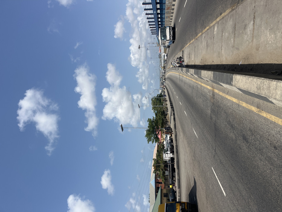 - "The image displays a multi-lane asphalt expressway under a clear blue sky with scattered white cumulus clouds, located within metropolitan Lagos, Nigeria, identifiable by the distinctive blue BRT (Bus Rapid Transit) infrastructure" by FM-vKXJ03, licensed under CC BY 4.0