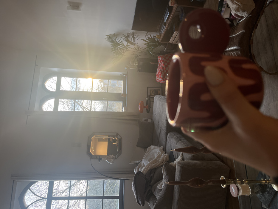 A person holds a pink and maroon patterned cup. The room features large windows casting bright sunlight, illuminating a gray sectional sofa with a white blanket. A unique mirror hangs on the wall. A vintage floor lamp stands next to the couch. Background includes a TV on a shelf, a plant, and other decorative items. The scene depicts a cozy, sun-drenched living space.