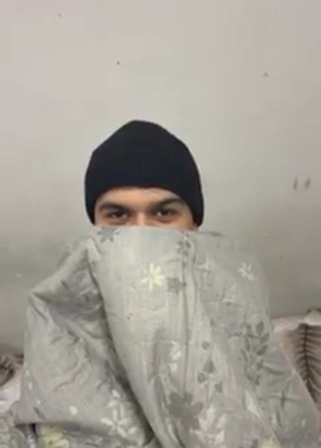 A man wearing a black knit cap is partially covered with a gray blanket that has a white floral pattern. Only his eyes are visible above the blanket. He is in a room with white walls.