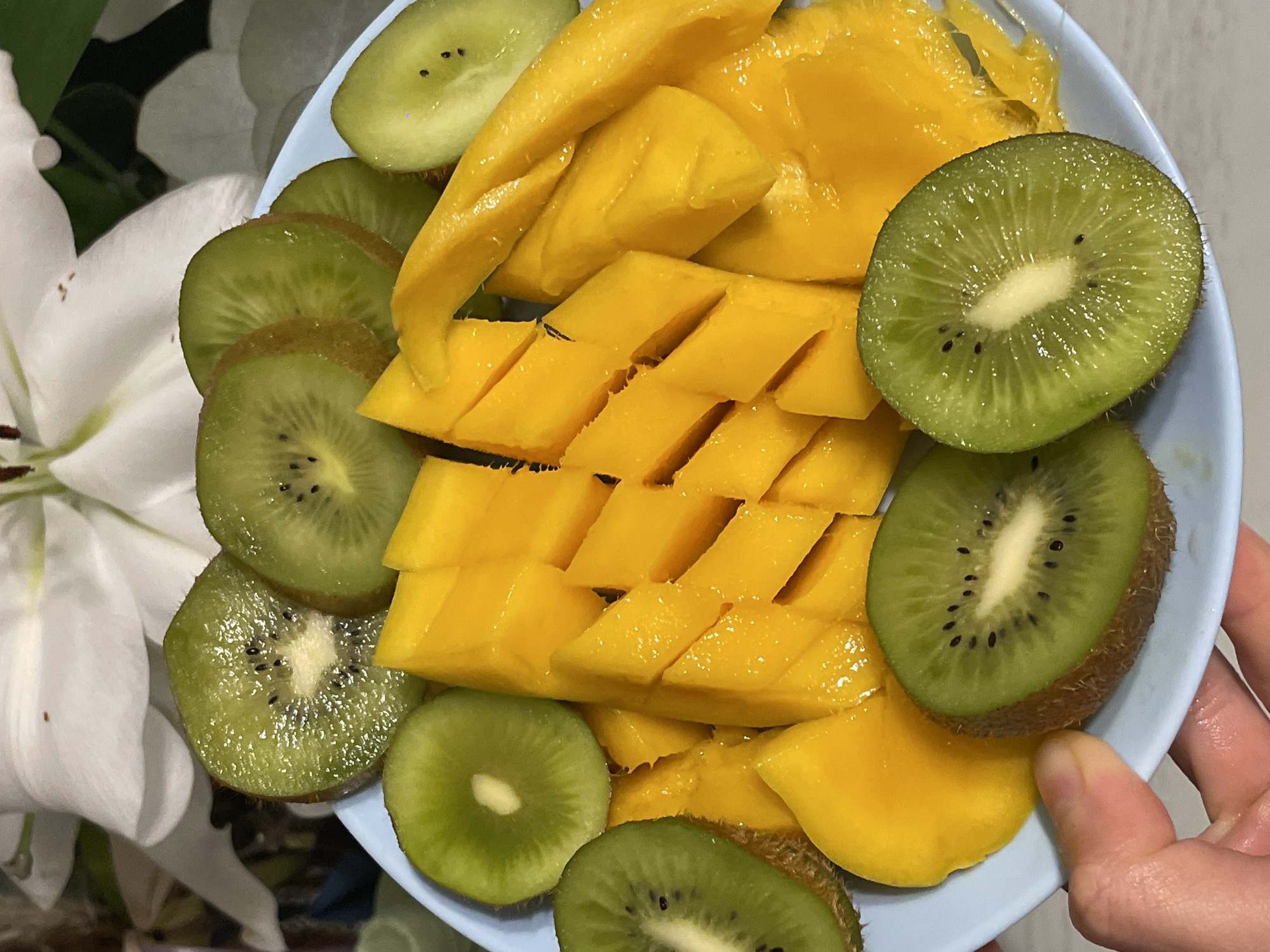 - "A light blue plate is presented, filled with sliced mango and kiwi" by FM-MKo1E3, licensed under CC BY 4.0