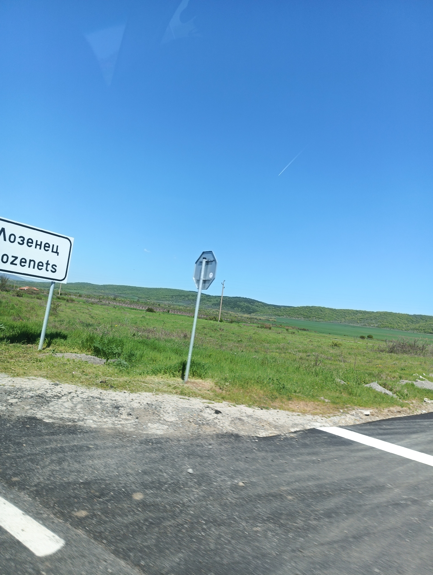 The image depicts a rural roadside scene near Lozenets, Bulgaria. A sign indicating "Lozenets" is visible on the left. Another road sign is to the right of the Lozenets sign. A recently resurfaced black asphalt road with white lane markings in the foreground suggests vehicular travel. Beyond the roadside, a grassy field leads to a horizon with a low, wooded hill. The sky is clear and blue. No people are visible.