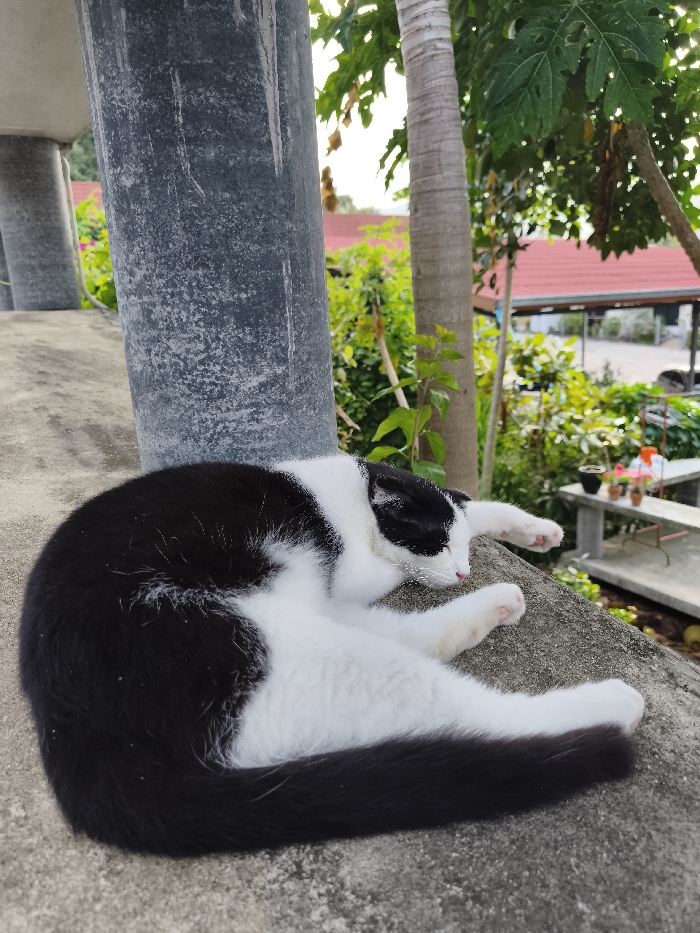 - "A bicolored black and white domestic cat is observed sleeping or resting on a light gray, textured concrete surface in an outdoor area of บ้านบางรักษ์, Thailand" by FM-H4hzl2, licensed under CC BY 4.0