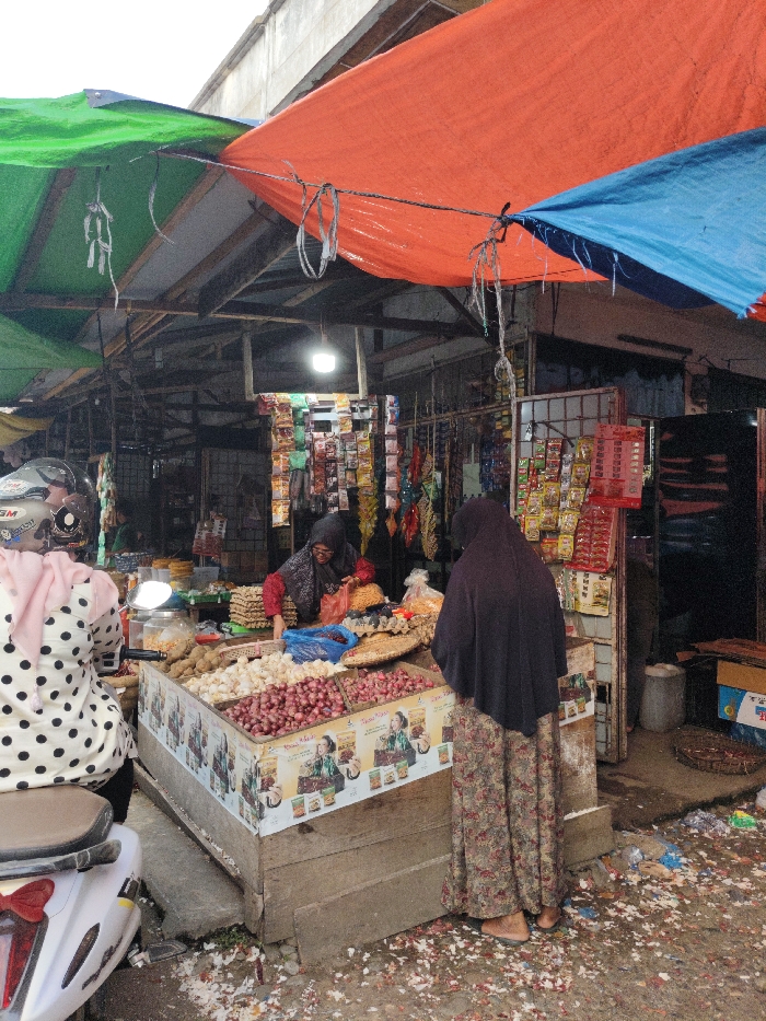 This image depicts an active open-air market stall in Wilayah Administrasi Gp