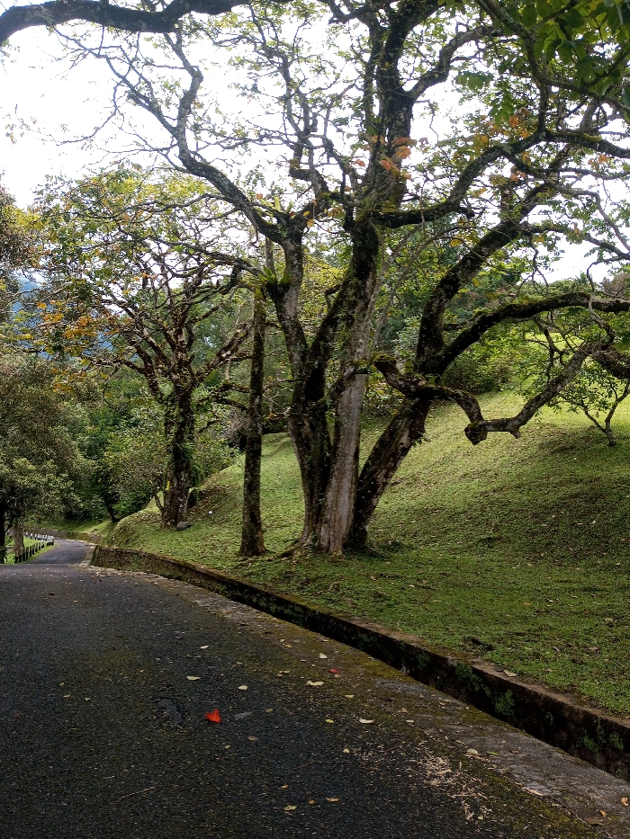 A road curves beside a mossy, grassy hillside dotted with trees. The trees have thick trunks and sprawling branches, some with moss and a few leaves clinging to them. A concrete drainage ditch runs along the road's edge. The road itself is asphalt with some scattered leaves. The sky is overcast, casting soft light.