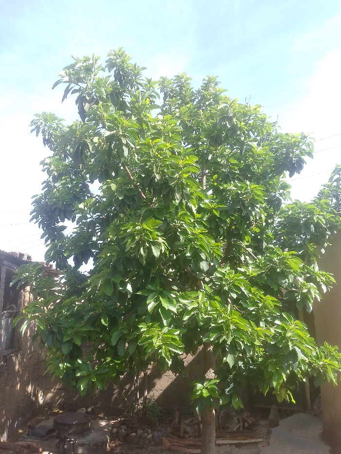 In Barakin Akawo, Nigeria, an outdoor scene is dominated by a mature avocado tree centered in the frame, showcasing dense green foliage and multiple dark, elongated fruits